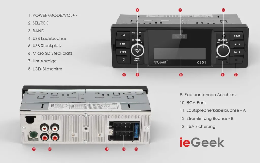 Be the first to review “IeGeek Autoradio Bluetooth 5.0 Freisprecheinrichtung, RDS/FM/AM Auto Radio LCD-Display, 2 USB/AUX-IN/SD, MP3 Player, 30 Sender Gespeichert Werden” Cancel reply